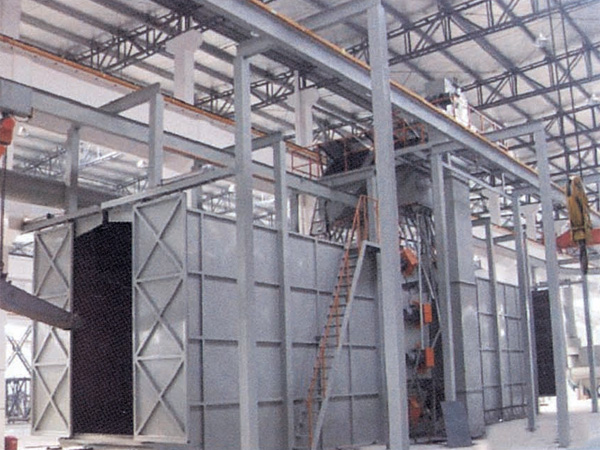 拋丸機清理室內熱區采用軋制Mn13 板防護,相對于以前的橡膠板防護,其使用壽命大大提高,且外形美觀、易于更換,是當今相對流行的清理機室體防護方式。